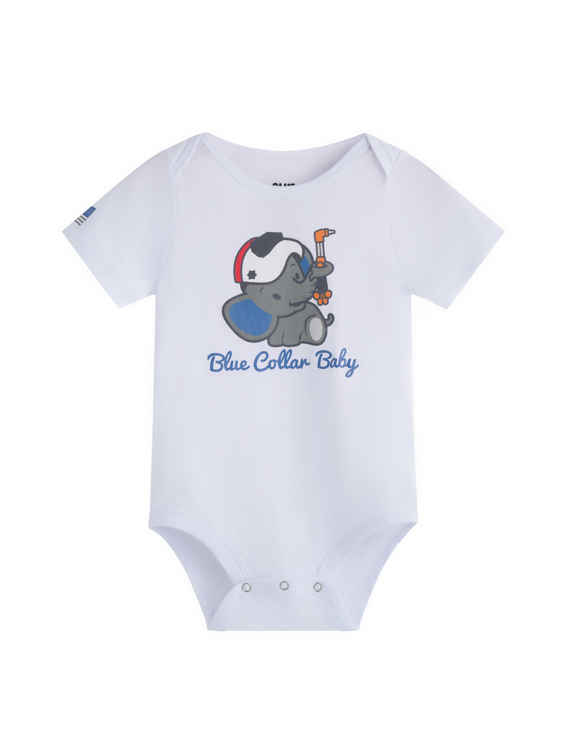 Big ears, steady hand, and a whole lot of spark—say hello to the Tiny Trunk Welder! This adorable Blue Collar Baby onesie features a sweet little elephant rocking a welding hood and proudly holding a cutting torch like a pro. Soft, breathable cotton keeps your baby comfy, while the playful print shows off serious blue-collar pride with a dash of cuteness. Finished with an American flag patch on the sleeve and easy-snap buttons for fast changes.