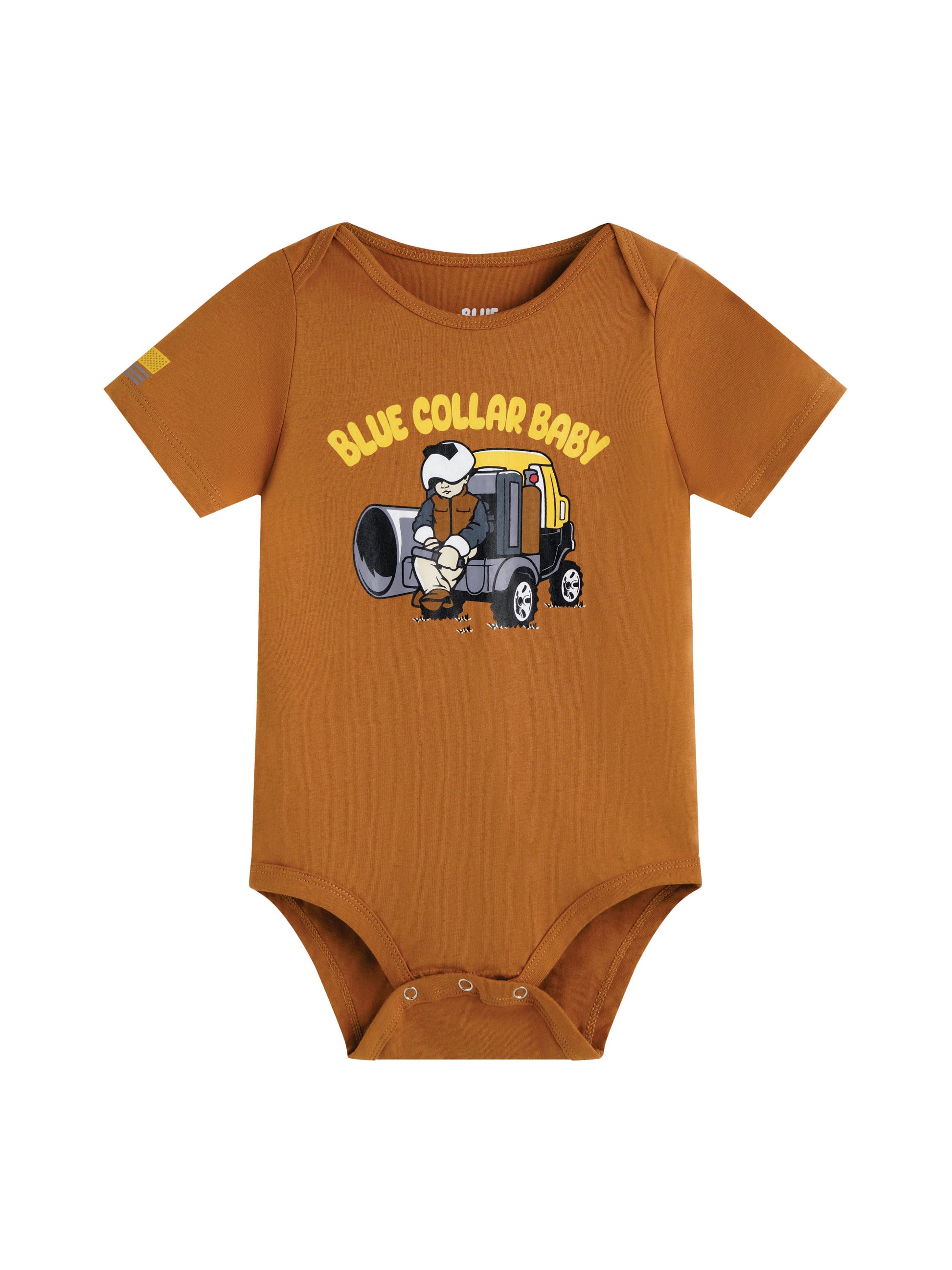 He may be small, but he’s running the whole job site! The Lil’ Pipeline Boss tee features a pint-sized welder perched on a giant pipe rig, suited up in a vest, helmet, and ready to work. With bold Blue Collar Baby lettering and a rugged rust-orange backdrop, this shirt is a salute to the next generation of hardworking tradesmen. Made from soft, durable cotton with a patriotic flag patch on the sleeve, it’s built for play, naps, and backyard weld-ins.